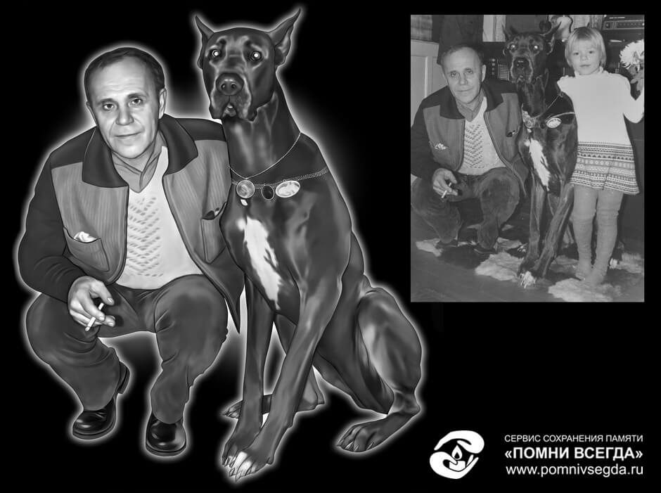 Одеты туфли на ноги, дорисована собака, портрет готов для нанесения ударно-гравировальным станком на памятник |
