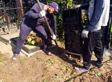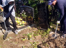 После того, как памятник был отодвинут, начинаем выравнивать его площадку. Досыпаем землю.